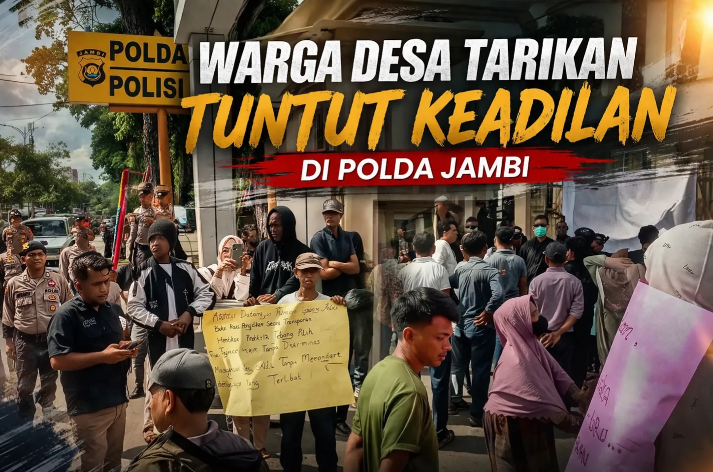 PenjuruNegeri.Com – Kota Jambi – Ratusan warga Desa Tarikan memadati halaman Polda Jambi, Selasa (07/04/2026). Mereka datang dengan satu tuntutan utama: keadilan atas penetapan Ketua Kelompok Tani, Ahmad Sabki, sebagai tersangka oleh Ditreskrimum Polda Jambi.
