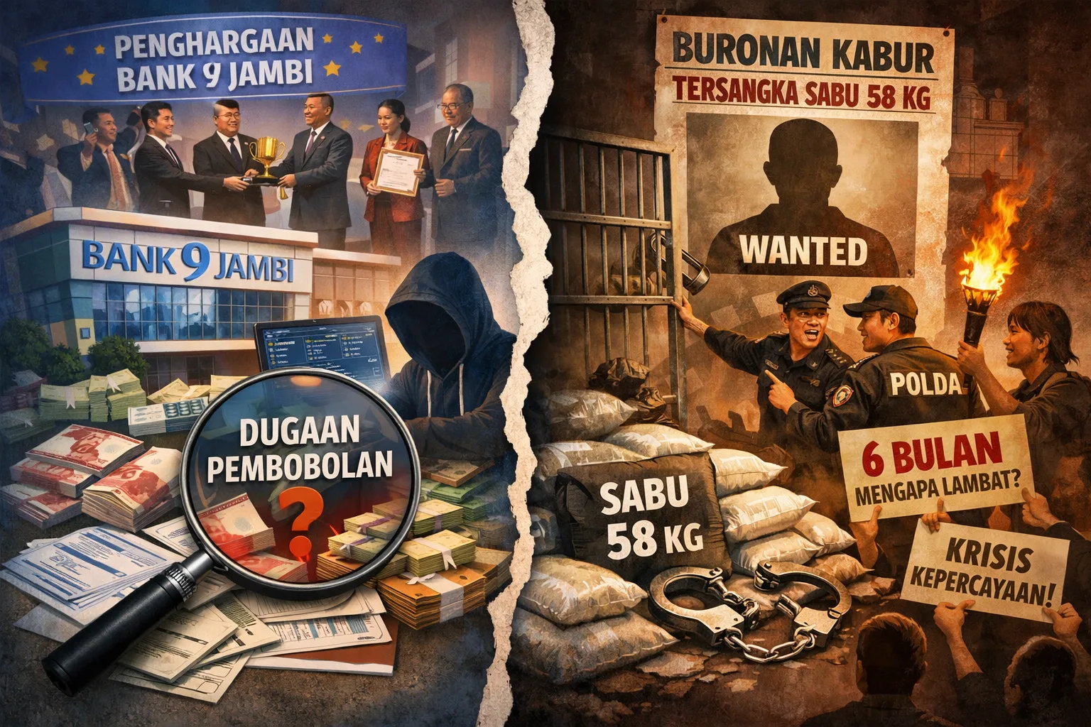 PenjuruNegeri.Com – JAMBI— Dua peristiwa besar mengguncang kepercayaan publik dalam waktu yang nyaris beririsan. Di satu sisi, sebuah lembaga keuangan daerah justru menuai penghargaan di tengah dugaan pembobolan dana. Di sisi lain, aparat penegak hukum dihadapkan pada sorotan tajam setelah kaburnya tersangka kasus narkotika dalam jumlah fantastis—yang ironisnya baru mencuat setelah berbulan-bulan berlalu.