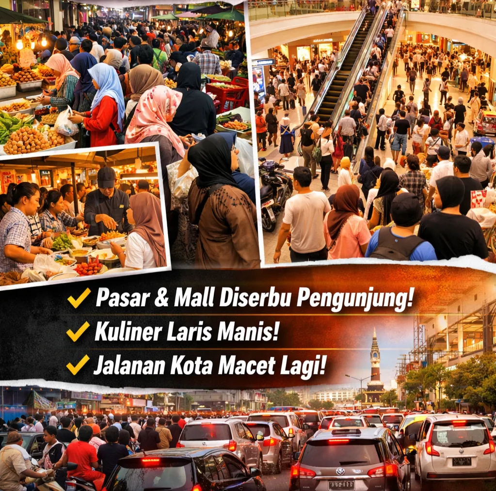 Sejumlah titik seperti pasar tradisional, pusat perbelanjaan, hingga kawasan kuliner tampak ramai oleh aktivitas warga yang kembali berbelanja maupun menghabiskan waktu bersama keluarga.